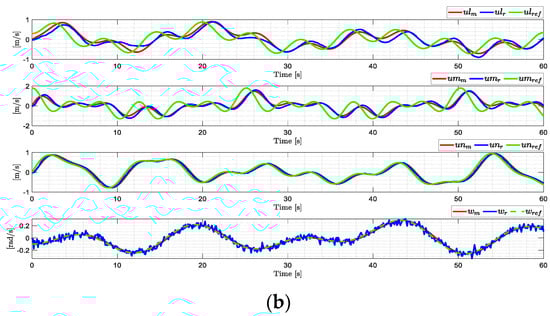 Velocities obtained from the dynamic model of the DJI Matrice 600 Pro, with the previously identified dynamic parameters, closely resemble the real UAV velocities behavior during its experimentation. (a) Validation scheme; (b) Velocity signals comparison.