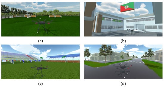 Virtual scenarios developed for the execution of trajectory tracking tasks, all related to real life. (a) Park Scenario; (b) Educational Center Scenario; (c) Stadium Scenario; (d) Neighborhood Scenario.