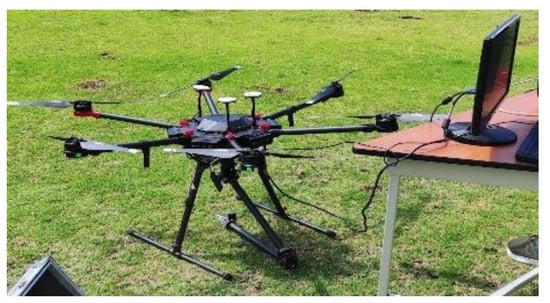 For the experimentation, the DJI Matrice 600 Pro was used as this UAV is designed for different industrial applications. It has six rotating propellers, which drive the movement of the hexacopter. It has a transmission range of 5 km and a capacity to move loads of up to 6 kg, and its 6 LiPo 6S batteries of 22.8 volts and 5700 mAh []. They allow it to have a flight autonomy of 38 min []. In addition to the standard software and hardware offered by this UAV, an Intel Nuc computer is integrated, which allows the execution of the control algorithms (see Figure 9). This modification makes it possible for control signals to be sent to the flight control board by running a Matlab script, which communicates wirelessly a remote station with the Intel board in the UAV.