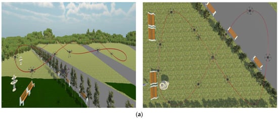 For this research, four different scenarios were developed, as shown in Figure 8. These scenarios can be classified as: (a) Park, an open place where there is abundant vegetation, such as grass, trees, and shrubs; we also find elements typical of a park, such as sidewalks and a water fountain. (b) Educational Center, there is a classroom building; it is a site with many constructions which would be obstacles for the navigation of the UAV, which has courtyards and parking lots. (c) Sports area, an open place where there is a diversity of sports venues, such as soccer stadiums, volleyball courts, tennis courts, and others, where there is a diversity of soils, such as sand, concrete, and grass, and has a little vegetation which are mostly palm trees. (d) Industrial Complex, shows a set of factories considering a moderate place in terms of space available for the execution of the task, has structures that resemble an industrial complex, and with spaces of vegetation, where trees and grass predominate.