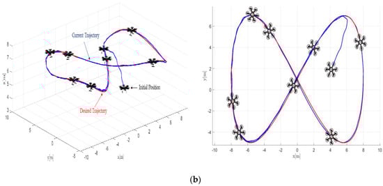 For this experiment, a displacement of the hexacopter is performed with respect to the plane , and of the global reference frame. Figure 10 shows the trajectory of the desired task, which tends to an infinite symbol trajectory with variations in the height for the axis. To analyze the performance of the implemented control scheme, the results obtained from the experimentation (see Figure 10a) are compared with those obtained from the simulation (see Figure 10b). Flight reconstruction is performed with the actual data obtained from the UAV.