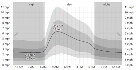 Wind speed on 2 February in Ambato. The average of mean hourly wind speeds (dark gray line), with 25th to 75th and 10th to 90th percentile bands. Civil twilight and night are indicated by shaded overlays.