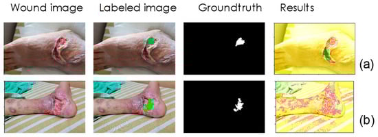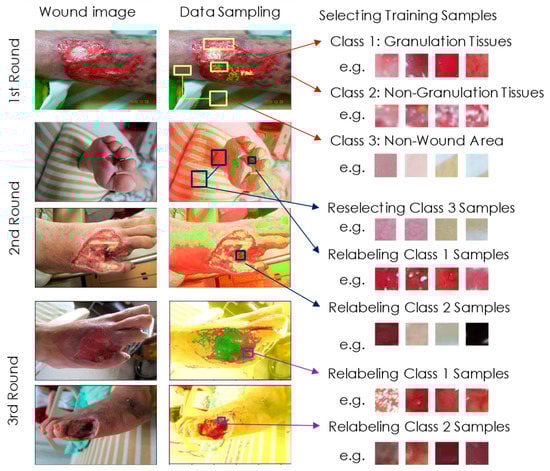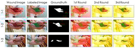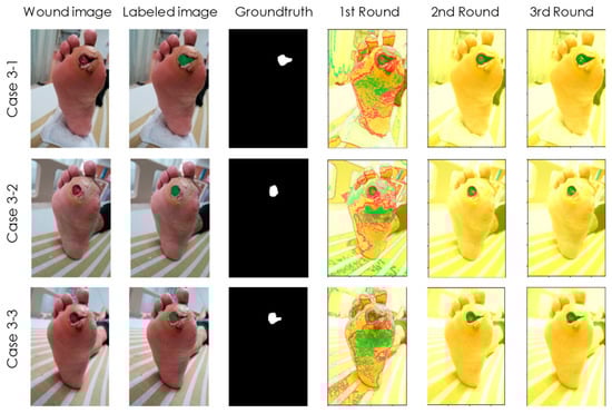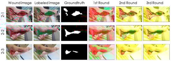 Figure 4. Interestingly, we found that the wound area near the heel was incorrectly classified from class 2 (non-granulation tissues) to class 3 (non-wound areas) after the third training session. However, this situation did not affect our detection for class 1 (granulation tissues).
