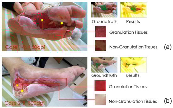 We also attempted to precisely detect non-granulation tissues (class 2) in our further research. By doing so, we can assess the proportion of granulation tissues in the wound bed. Here, let us discuss why we could not properly identify non-granulation tissues in case 2 and 3. As a comparison, we also review the successful detection example of case 1-2. We found that the main difference between these two cases is the resolution of the images. The image resolutions were 150 and 300 dpi for cases 1-2 and 2-3, respectively. These two images are compared in