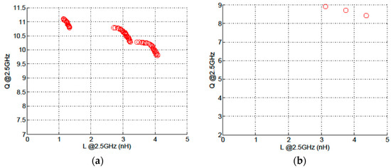 If a conventional multi-objective optimization algorithm (e.g., based on Pareto ranking [23] or based on decomposition [24]) is applied to the maximization of inductance and the quality factor at 2.5 GHz, subject to the constraints in Equation (1), the Pareto fronts in Figure 4 are obtained for two different area constraints. The designer is typically interested in obtaining the inductor with the maximal quality factor for a given inductance. By looking at the inductance–quality factor plot in Figure 4a, it might seem that inductance values below 1.1 nH or between 1.4 nH and 2.6 nH are not achievable for inductors that fit in a 200 μm-side square. Furthermore, by looking at the front in Figure 4b, it seems that only three inductance values are achievable with this area constraint. However, this is not the case. The Pareto fronts in Figure 4 do not mean that inductances of, e.g., 2 nH are not achievable; they only indicate that, although they may exist, there are other solutions with a larger inductance and the same or higher quality factor.