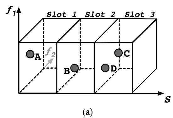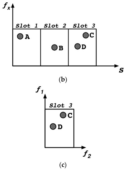 Consider, for illustration purposes, the problem in Figure 5a with one sweeping objective, two minimization objectives and three slots. Solutions A and B, or B and C, are non-dominated between them because they belong to different slots of the sweeping objective . However, considering only solutions C and D, solution D dominates solution C because both belong to the third slot, and, as illustrated in the projection in Figure 5c, solution D is better in both objectives.