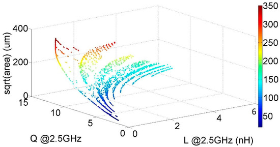 Let us now consider another example with the same constraints as the previous ones (except for the area constraint, which is now ) and three objectives: a sweeping objective (the inductance), a maximization objective (the quality factor) and a minimization objective (the area). The execution of the algorithm, with 1000 individuals, 200 generations and 50 slots, yields the results in Figure 8. It is interesting to highlight here a specific front pattern, which is especially noticeable in the lower part of the front. This pattern is due to the number of turns of inductors, which can only take integer values. On the other hand, it can be seen that there is still a discontinuous pattern of the front in the other dimensions since the area and quality factor trade off in the conventional Pareto sense.