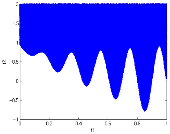 The graphical representation of the most interesting region of the objective functions is shown in Figure 9, where the possible objective function values that the solutions can take are shaded in blue. The true Pareto front of the minimization problem shown in Equation (5) is given by