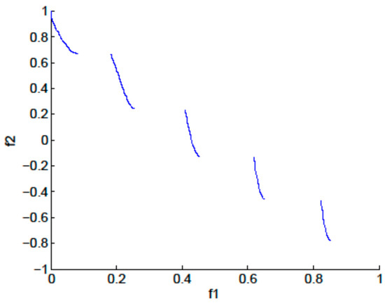 There is no mathematical benchmark problem specifically defined to develop, test and compare this optimization algorithm, as this type of problem has not been reported before. However, some existing benchmarks for conventional multi-objective optimization problems, whose solution is a discontinuous Pareto front, can be easily adapted to the optimization problem reported here. Let us consider, for instance, the conventional minimization formulation of problem ZDT3 defined in a 30-dimensional (n = 30) search space as follows [28]:
