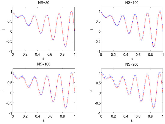 Optimization results on the proposed mathematical benchmark problem for six different settings of the NS parameter. The true SPF is plotted with a continuous red line.