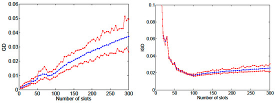 Generational distance (GD) and inverted generational distance (IGD) vs. the number of slots for the optimization problem in Equation (10). Blue dots correspond to the mean values of 100 executions. Upper and lower red dots correspond to the worst and best executions.