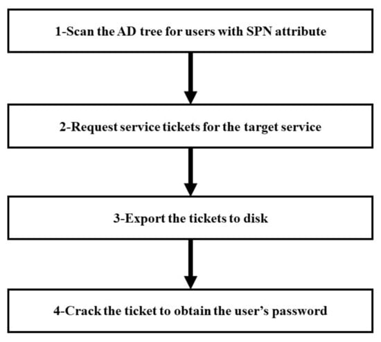 - Kerberoasting attack: Kerberoasting is an attack relying on the fact that some services run under normal user accounts. If a service runs under a user account, the service ticket provided by AD for this service is encrypted by the NTLM hash of the user’s password. Grabbing the ticket and brute forcing it allows access to the plaintext password of the target user. The service principal name (SPN) attribute of a user indicates if a service is running under this user account. The procedure for performing a Kerberoasting attack is shown in Figure 3, and it is carried out as follows: