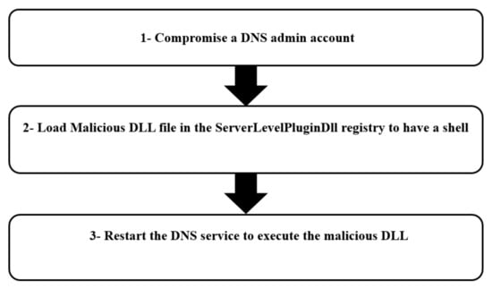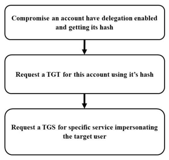 Figure 4. Constrained Delegation Abuse Flow.One interesting fact about this attack is that the SPNS is not checked when requesting TGS, which leads the attacker to access any service running under the same account. For example, if the CIFS service is listed in the msDS-AllowedToDelegateTo attribute then the attacker can access any service which is running under the same account as the CIFS service [35]. The above fact can lead to the compromise of the entire domain if exploited successfully.Mitigations for constrained delegation abuse typically put critical accounts in the protected users group or mark the account as sensitive and cannot be delegated on the account tab [36]. - Abusing DNS admins’ privileges: Abusing DNS admins’ privileges is a technique where a DNS admin member can escalate their privileges to system privilege if he has the rights to configure server-level plugin DLL and to restart the DNS service [36]. By injecting a malicious DLL executing a reverse shell to the attacker machine into the dns.exe service and restarting the service, the attacker can have a shell on the DNS server as a system account which is the highest privileged account.While the DNS admins are not granted the necessary privileges by default, it is common for DNS admins to be given the right to restart the DNS service and to inject the DLLs in the HKEY_LOCAL_MACHINE∖SYSTEM∖CurrentControlSet∖services∖DNS∖Parameters∖ServerLevelPluginDll registry.The stages for performing this attack are shown in Figure 5 and are illustrated as follows: The attacker compromises a machine having a ticket for a DNS admin user and having a local admin privilege on it. The attacker uses the ticket to inject the malicious DLL file containing a reverse shell in the ServerLevelPluginDll registry. Next step is to force a restart for the DNS service. Once the DNS service is restarted, the dns.exe executes the malicious DLL as the system user and returns a reverse shell to the attacker as the system account. If the DNS server in the environment is the same domain controller server, the above attack leads to the compromise of the entire domain. Common mitigations for this attack are monitoring the DNS service status and the ServerLevelPluginDll registry for any changes and limiting the privilege to load DLL files to only specific users, not all the DNS admins, if required.