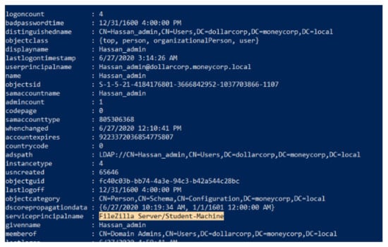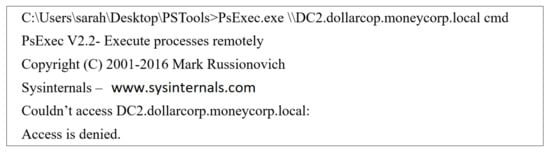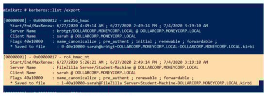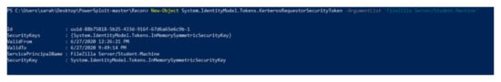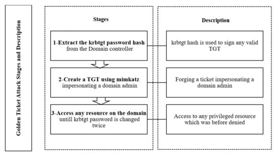 - Golden ticket attack: Golden tickets are user-created TGTs which are used to give the attackers access to specific resources. Intruders use the TGTs to obtain service tickets from the domain controller without verifying the contents of the TGT [37]. In Kerberos protocol, the TGT is used to prove to the KDC service on the domain controller that the user is authenticated to the DC. The TGT is encrypted with the krbtgt account NTLM hash. The way the KDC verifies the integrity of the TGT is by trying to decrypt it with the krbtgt hash. Once it is decrypted successfully, the KDC grants the user the service tickets without verifying the contents of the TGT unless the TGT’s age is older than 20 min [38]. Given the above behavior, an attacker who has domain admin privileges to the DC can follow the steps in Figure 6 to dump the krbtgt hash and use it to forge a TGT impersonating any user and persisting with high privileges for a very long time. Interesting facts about this attack are that the attacker can impersonate any user, even if the user does not exist in the domain on any machine joined or not joined to the domain, and also that the krbtgt password is rarely changed [38]. Once this attack is carried out successfully, the only way to stop it is to change the krbtgt account password twice. The dumping and generation of golden tickets are usually conducted using the Mimikatz tool, which provides the ability to modify the security identifier (SID) history attribute in the TGT. The SID is an identifier that is used by the AD system to verify the privilege of a user, and the SID history is an attribute that includes more than one SID. This attribute can be exploited to include the SIDs of various domains and exploit the entire forest.