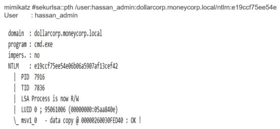 - Pass the hash attack: The pass the hash (PTH) attack has been evolving for years. It depends on hash extraction from a compromised machine and using this hash to create tokens that allow access to sensitive resources or hosts across the domain. While Microsoft has been implementing many security measures in each new Windows version to prevent PTH attacks, new techniques evolve continuously to carry out this attack successfully [25].Windows hosts store credentials in the form of NT hashes [25]. In PTH attacks, adversaries use the fact that NTLM hashes can be used for authentication without using the user’s password. PTH involves two stages: (1) the first stage is extracting the hashes of certain users depending on their availability and (2) the second stage is creating tokens using extracted hashes by tools such as Mimikatz [26]. It is important to note that PTH can give attackers privileges equivalent to the user’s password without having to know the actual password. Attackers usually try to extract high-privileged accounts’ passwords and use them in PTH attacks to escalate their privilege.The most common technique to carry out stage (1) is to dump the credentials in the memory of the Local Security Authority Subsystem Service (LSASS) process. LSASS stores information in its memory about all accounts that are used actively including the NT hash [27]. These hashes are used to provide a single sign-on experience to users in order to avoid entering the password each time the user wants to access a resource [28]. Extracting the hash of a domain admin account provides the attacker with the ability to access the same resources granted to the domain admin user without knowing its password. The most secure measure to protect against PTH attacks is to protect the memory of the LSASS process and prevent accessing it [29]. This feature is implemented in Windows Defender Credential Guard (WDCG) which makes the LSASS process not accessible to malicious applications [29]. While this feature prevents hash extraction from LSASS memory, other ways can be used to extract the hashes [30].
