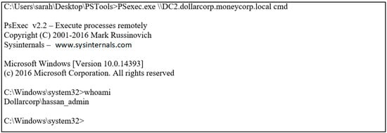 /ntlm:e19ccf75ee54e06b06a5907af13cef42. We assured the escalation of privileges by running the psexec command on the domain controller to open a CMD, and the command ran successfully, which indicated that we then had domain admin privileges. Figure 8, Figure 9, Figure 10, Figure 11 and Figure 12 show the output of the commands issued on the compromised machine. Figure 8 shows that initially trying to run psexec on the domain controller gave permission denied, which was expected, as the user still had local admin on the client machine only. Figure 9 shows that the privileges had been elevated in Mimikatz and the tool was able to dump the NTLM hash from memory. Figure 10 shows the hassan_admin user NTLM hash in the LSASS memory. Figure 11 shows the output of the pass the hash command, which shows that a ticket with admin privilege had been issued successfully. Finally, Figure 12 shows that PSEXEC command had been run successfully on the domain controller.