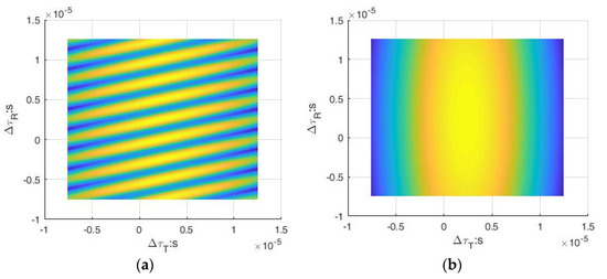 where and represent the complex envelopes of the target signal and reference signal waveforms, and are the attenuation factors at the two receivers, and are the random phases produced by the mixers of the two receivers [35], and are the TDOA of the target signal and reference signal between the two receivers, is the time synchronization error between the two receivers, and and are white Gaussian noise which are uncorrelated with and .