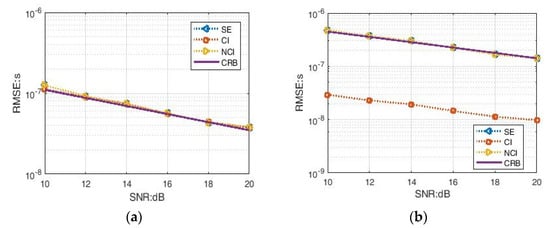 The CRBs in Figure 4 were calculated for the SE method of a single signal, making independent use of the parameters of the target signal or reference signal. While the CI method uses the information of the two signals based on coherent integration, its theoretical performances and CRBs need further research, therefore, the CRBs for the CI method are absent in this manuscript. Since the CI method uses the frequency information of two signals, the occupied frequency band is wider than the single target signal, and the main lobe is much sharper than the separated estimation method, as shown in Figure 2. Therefore, the RMSE of CI is much lower than the result of SE, while the CRB is calculated for SE, thus, the RMSE of CI is much lower than the CRB in Figure 4b.