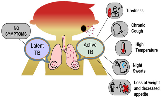 TB is an airborne bacterial infection caused by Mycobacterium tuberculosis (MTB), which mainly attacks the lungs [13]. However, the microbe may also spread to other body parts, such as the guts, skeleton, brain, and gland, from the lungs via different routes. When an infected TB person sneezes, spits, or coughs, the bacteria are expelled from the body. If inhaled by a healthy person, even in minimal quantities, these bacteria can cause TB [14]. People who exhibit symptoms are called active TB (ATB) patients [15], whereas TB patients without any signs are called latent TB (LTB) patients [16]. LTB patients cannot spread the disease to other people but have a high risk of developing TB if they do not maintain a healthy lifestyle (Figure 1). Moreover, people with weak immune systems due to infections such as diabetes and HIV; undernourishment; or people prone to using tobacco products are at high risk of catching TB if they come into contact with a TB-infected person [17]. When the bacteria can invade other body organs such as the bone, spine, and brain, it is called extrapulmonary tuberculosis (EPT). Miliary tuberculosis is a rare type of active TB in which the mycobacterium enters the other body organs via blood vessels. It infects various organs at once, including the lungs, spinal cord, and heart, making this kind of TB disease highly deadly [18]. Active TB is further classified into multidrug-resistant TB (MDR-TB) and extensively drug-resistant TB (XDR-TB). MDR-TB shows resistance to first-line antitubercular drugs due to the patient’s irregular treatment or insufficient and inadequate quality supply of drugs for the treatment. XDR-TB is resistant to both first-line and second-line antitubercular drugs (capreomycin, kanamycin, and amikacin) [19].
