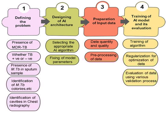 The application of a specific AI algorithm in TB diagnosis is a process that needs a proper understanding of the problems involved. The necessary steps in model construction include defining the problem, collecting adequate and related data, designing the AI algorithm’s architecture, training and evaluating the model, and correctly interpreting the output [61] (Figure 2). The first step involves problem identification, selecting the appropriate machine learning process, and an algorithm depending on the investigation problem [62]. The problem data can be divided into generative and discriminative inputs. The next step is to prepare a suitable model structure with appropriate algorithms such as SVM, RF, DT, ANN, etc., and fix model parameters with a clear idea about the problem. The parameters of the algorithms vary from one to another [63]. For example, in a neural network, the number of hidden layers and neurons can be the criterion, and the number of kernels can be a criterion in SVM. After the model structure is resolved, the dataset must be prepared. The quality and the quantity of the input data play a crucial role in determining the quality of the model under development. Once the model’s structure and input dataset are ready, the model’s training and evaluation are done. This training step aims to reduce the prediction error and increase the model’s efficiency. The final developed model should express the relation between the parameters and the developer’s purpose of model building. If the essential goal is not met, the model can be fine-tuned using pertinent data to accomplish the objective [63,64].