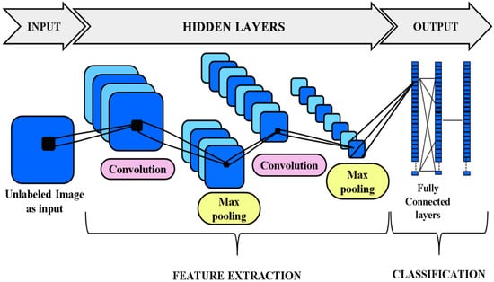 CNN is a deep learning class that uses feed-forward artificial neural networks to analyze images [83]. It is considered state of the art for image classification due to the connectivity pattern between its neurons, which are arranged so that they respond to overlapping regions building the visual field. It consists of many hidden layers, out of which the important ones are the pooling layer and fully connected (FC) layers. The pooling layer reduces the image’s spatial size without changing the depth, and the FC layers are generally placed before the final output layer, where the image classification process starts [84]. CNN is motivated by biological processes and variations of multi-layer neural networks designed to use minimal amounts of pre-processing [85]. Moreover, due to its non-requirement of domain knowledge, it can extract and learn meaningful features by segregating the target classes during the training phase [83] (Figure 4).