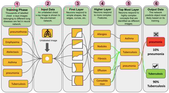 The model was pre-trained using a transfer learning process, which helped to overcome the problem of handling high-resolution X-ray images and training many parameters using limited images, which led to the model’s high performance [12]. Furthermore, deep learning has also been used to develop state-of-the-art tools such as CAD4TB, Lunit INSIGHT, qXR, etc., for early and efficient TB diagnosis. This review focused on aspects that have already successfully demonstrated its usefulness as a promising sub-field and will reflect refinement and promise for the new AI phase in TB diagnosis.