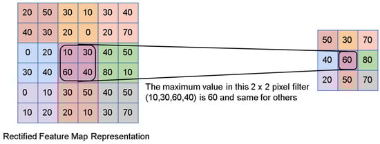 Pooling layers: The pooling layer is another essential layer (the max-pooling layer (Figure 7)) in the CNN model that shrinks down a large image while preserving the essential data. It means that it keeps the maximum value of the pixel window, i.e., the best fit of the feature within the pixel window, and makes the output have few pixels but with the same number of features [88]. For example, in a chest radiograph, the max-pooling layer will be done for each feature, such as the shape of the cavity, opacity area, density of the cavity, etc. This layer helps in reducing the computation load and solves the problem of the system being hyper-literal [90].