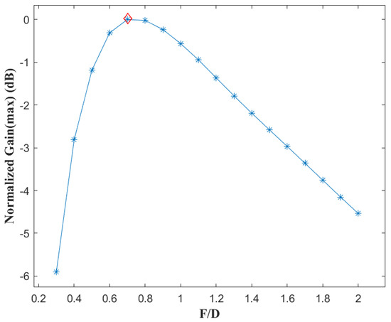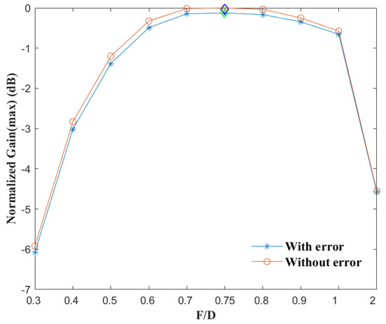 Based on the above analysis, combined with engineering experience, it can be expected that, when there is no feed position error, the antenna gain will first increase and then decrease with the ratio . However, when feed is displaced, the gain loss corresponding to different will be different and difficult to be predict accurately.