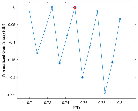 First, it was necessary to find the corresponding to the maximum peak gain, and the maximum peak gain was used for subsequent comparison and analysis. Figure 3 gives the experimental results of the maximum peak gain corresponding to = 0.3:0.1:2.0. It can be seen from Figure 3 that the value of corresponding to the current maximum peak gain was around 0.7, and the value of every peak gain in Figure 3 was normalized by the peak gain when = 0.7. By taking the maximum peak gain as the goal objective, and taking the value of as the optimization variable, the solution is shown in Figure 4. The value of corresponding to the maximum peak gain was 0.75, and the value of every peak gain in Figure 4 was normalized by the peak gain when = 0.75.