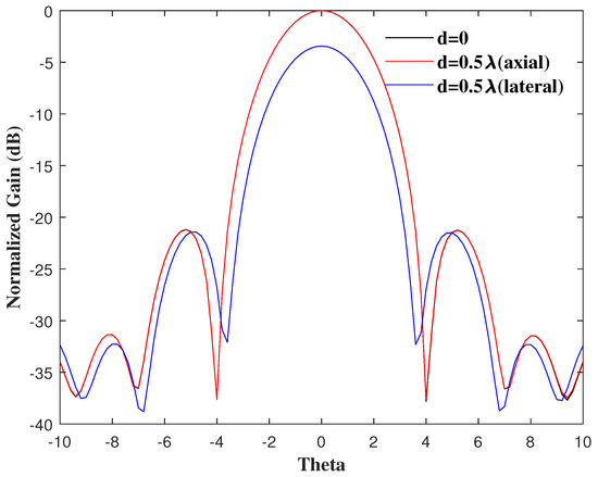 The feed displacement can be decomposed into axial and lateral. Compared with the lateral position deviation of the feed, the influence of the axial displacement on the antenna performance was much smaller, which can be verified by Figure 5. Figure 5 shows the far-field patterns for d = 0, 0.5 (axial) and 0.5 (lateral) when = 0.75. The first two almost completely coincided and differed from the last one. Thus, research should focus on the lateral displacement of the feed according to the above results and analysis.