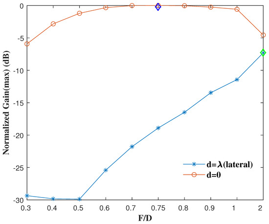 Figure 6, Figure 7 and Figure 8 show the peak gain of each with feed lateral displacement d = 0.1, 0.5 and , which are normalized with the peak gain of the antenna without feed displacement when = 0.75. The gain degradation shown in Figure 6 was relatively small when the lateral displacement of the feed was 0.1 . For all focal lengths F, , which determines the results and is a relatively ideal situation in practical engineering, was quite small. In addition, when 1, the degradation of the antenna peak gain was higher than that when > 1, and the major factor was the size of F.