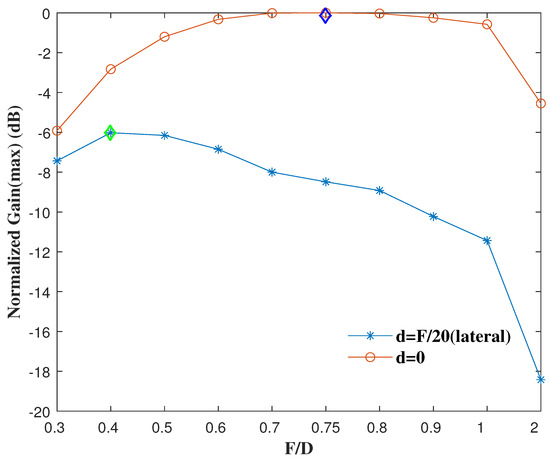 The effects of displacement are not similar for different values of F. In practical antenna design, some redundancy is usually considered. Figure 9 shows the peak gains when the feed displacement was F/20 for all . The maximum peak gain in this case corresponded to = 0.4. In addition, gain loss decreased as focal length decreased; however, except for = 0.3 and 0.4, all the peak gains exceeded more than 5 dB.