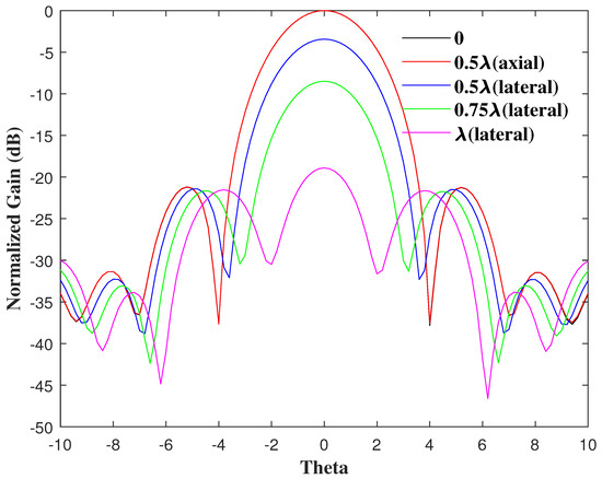 When = 0.75, the far-field patterns of feed lateral displacement at 0, 0.5 (axial), 0.5 (lateral), 0.75 (lateral) and (lateral) are shown in Figure 10. This simulation was carried out to analyze the effect of feed displacement at the initial optimum = 0.75. The gain changes were expected and consistent with the results above. Axial displacement had little effect, and gain loss increased rapidly as lateral displacement increased. Although the antenna gain decreased, the beam width decreased when the lateral displacement increased. For the engineering background of this paper, the gain is the main consideration, but when the beam width is the main limitation, this situation is worth referring to and digging into deeply. Furthermore, the differences in the first side-lobe level were relatively small, which may shed light on some specific research.