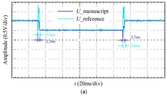 For the positive- and negative-sequence component of the three-phase unbalanced voltage sag, the amplitude detection results of the oscilloscope are shown in Figure 16. Considering the signal delay of the processor and logic devices, the sag detection time in the test has 0.1–0.2 ms delay compared with that in the simulation, but the overall detection time is still within 3 ms for the proposed detection algorithm, which verifies the feasibility of the detection algorithm. In addition, during the dynamic response of the sag, the voltage amplitude variation detected by the detection algorithm is more stable, which shows better anti-interference ability compared with the reference algorithm.