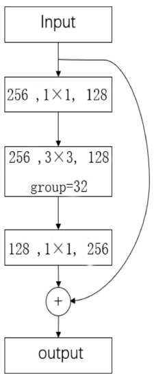 The convolutional network used in this paper is ResNeXt101 [19], and the main body consists of four residual modules. The structure of the residual modules is shown in Figure 4. In the input–output convolution layer, a small convolutional kernel of 1 × 1 × 1 is used, and the middle group convolutional structure uses the usual base 32 with a size of 3 × 3 × 3. The advantage of ResNeXt101 is that the group convolution is performed by stacking blocks of the same topology in one parallel, which improves the accuracy without increasing the parameter complexity.