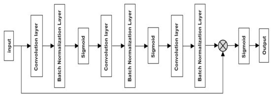 In the excitation step, the globally averaged features obtained in the squeeze step are fed into a two-level full connection (FC), a rectified linear unit (ReLU) [17], and a Sigmoid function [18] to output a channel weight vector of dimension 1 × 1 × C′ (C′ < C) of the channel weight vector. where the output layer changes from 1 × 1 × C′ to 1 × 1 × C, i.e., the weights assigned to the features represented by each channel.