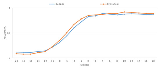 As shown in Figure 8, the improved ResNeXt network structure has a fairly good recognition accuracy overall. Although there is a slight decrease in accuracy at low signal-to-noise ratios, there is an improvement in both the middle and high segments. The reason is that the group convolution strategy of the ResNeXt network itself improves the recognition accuracy but reduces the generalization performance (i.e., the effect is reduced when facing complex signals with low signal-to-noise ratio). In contrast, in this paper, the residual structure of ResNeXt is improved so that the extracted deep and shallow features are fused with each other. Although this improvement suggests the overall performance of the network, it has little effect in compensating for the drawback of generalization performance. Therefore, we introduce a compressed excitation structure on top of the residual fusion structure to improve the generalization ability of the network.