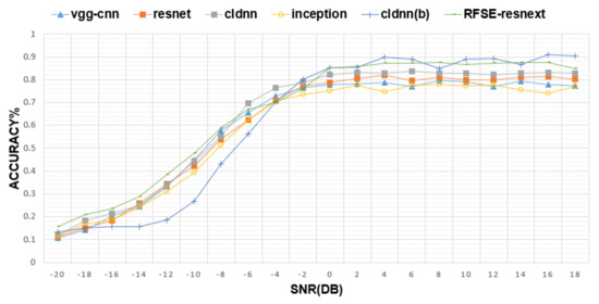 As shown in Figure 9, the model proposed in this paper shows a considerable improvement in recognition rate in the −20 dB to −8 dB interval even when compared with the current newer models and also has a fairly good recognition accuracy at high signal-to-noise ratios. The rFSE-ResNeXt can achieve this result, and it is important because rFSE-ResNeXt is the only model among these that has the SE module and advanced grouped convolutional structure. The former allows the network to use more energy to focus on the typical features of the signal and achieve better results with the same number of parameters; the latter allows the network to extract sample features significantly, further improving the accuracy of the network. Meanwhile, RFSE-ResNeXt further improves the ability of extracting signal features due to the improved residual network structure, which makes the deep and shallow features fuse. Because of this, it has quite good performance in the face of the close-to-reality RML2016.10A dataset used in this paper.