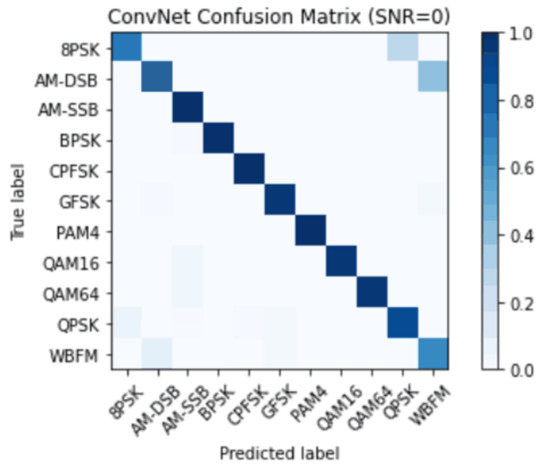 Figure 10 and Figure 11 show the confusion matrix plots of ResNeXt and the network model in this paper at the signal-to-noise ratio of 0 dB, respectively, which can visually reflect the recognition effect of the model for the 11 signal modulation methods. Since ResNeXt adopts the strategy of group convolution, although it greatly improves the ability of extracting feature information, it does not perform well in the face of signals with low signal-to-noise. It can be seen that there is a problem of misidentifying some WBFM as AM-DSB at 0 dB, and confusing some 8PSK and QPSK, which leads to a low recognition rate of 8PSK, WBFM, and QPSK signals. The overall recognition accuracy of the RFSE-ResNeXt network model proposed in this paper is improved, especially since the phenomenon of confusing AM-DSB into WBFM is attenuated.