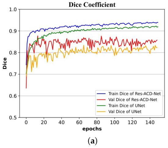 Training and validation processes on the ISIC-2016 dataset: (a) curves of Dice coefficient; (b) curves of Jaccard index.