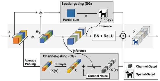 Accordingly, dynamic-network-based gating architectures have been deployed to expand work-skipping opportunities through enhanced sparsity with gate functions [10,11]. In the decision-making scheme of dynamic networks, the gate function is a general and flexible approach to generating binary gate masks for selectively activating model components such as blocks, layers, channels, and auxiliary networks. Furthermore, the gate function can also be adapted to an arbitrary location in any backbone network as a plug-in module. The gating architectures can leverage the potential sparsity of the components by collaboratively considering various aspects of the models, such as the spatial-wise features of images and the dynamic network structure.