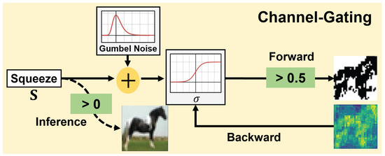 The channel-wise technique selects effective channels on the fly during forward propagation based on the fact that the same channel can be of disparate importance for different samples [47]. Similar to pruning, Liu et al. [14] utilized the scaling factor of batch normalization as a channel pruning with a global threshold to simply adapt to CNNs and used lasso regularization to increase sparsity. To select individual channels, Chen et al. [39] proposed a completely separate network rather than using the existing structure. On the other hand, a nondifferentiable method of top-k pruning after ranking based on channel saliency was suggested [40]. To address the lack of differentiability, Bejnordi et al. [41] engaged channel pruning with the Gumbel-SoftMax trick and coined a batch-shaping loss using posterior probability, while CSGN applies a gating module to every 3 × 3 convolutional layer per residual block.