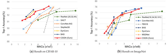 Table 4 shows a summary of the 1.37–13.12× MAC reductions with accuracy degradation on baseline ResNet18/34/50/101. Figure 3b shows the trade-off between top-1 accuracy and MACs with other gating networks under optimal conditions of CSGN. The results present that CSGN outperforms the other studies in high top-1 accuracy at similar computation costs in the same ResNet baseline architectures. In the baseline of ResNet18/34/50/101, the top-1 accuracy was achieved at 69.39%, 73.35%, 75.19% and 76.21%, respectively, when the was 0.8. Compared to CIFAR-10, when a large number of residual blocks in ResNet, it is clear that the performance difference was more significant than in other networks.