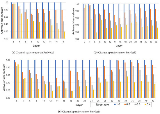 To evaluate the global sparsity loss of the CG, we analyzed the sparsity per layer on ResNet20/32/44. The activated channels per layer in Figure 4 indicate that the first layer is less sparse than the last. This indicates that the anterior channel is more important than the posterior one. According to the CG target rate, global sparsity changes; however, the sparsity of anterior layer barely shifts.