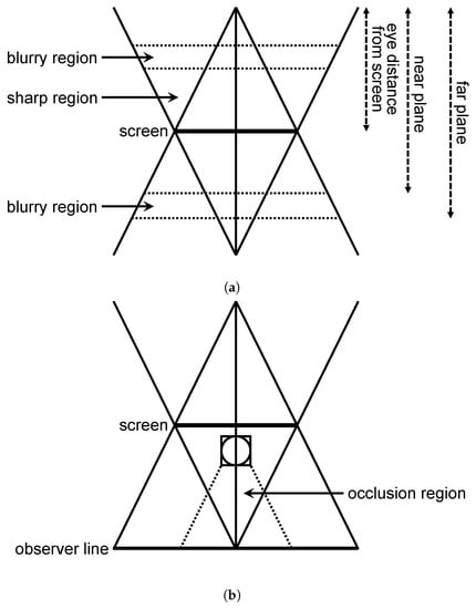 - Blurry region: Figure 7a shows the top view taken from the LFD setup. Unlike conventional displays, LFDs have double frustums placed in front of and behind the screen, illustrated with the black line. The viewing angles enclosing the frustums are depicted by the blue lines. Considering LFDs, the area enclosing the screen contains the objects that are sharply rendered. In this metric, we calculated the number of objects that were rendered outside the sharp region.