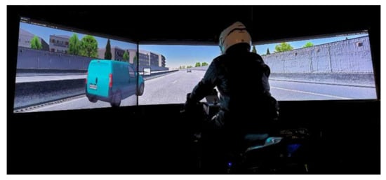 Our motorcycle-riding simulator (pictured during an experiment in Figure 6) was initially developed in 2006 as part of the SIMACOM research project, supported by the French National Research Agency (ANR). It has since been used in several human-centered studies (most recently, in [19,20,21,22]) but is still a research object.