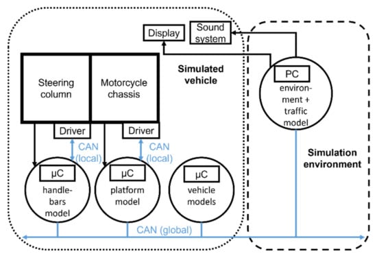 The embedded calculators exchange data with each other and with a centralized PC. The latter computes a multi-agent traffic model and renders the visual and auditory environment to the rider. The PC can also log data if needed (for experimental purposes). The hardware/software architecture is represented schematically in Figure 8. This representation highlights that the motorcycle-riding simulator is composed of the following two parts, as previously mentioned: (1) the simulated vehicle and (2) the simulation environment.