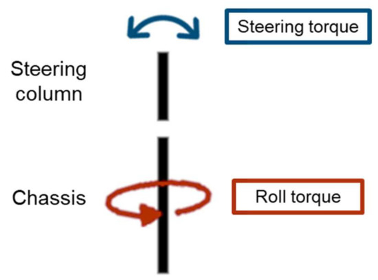 Because of the instability inherent to inverted pendulums, driving a motorcycle is a more complex task than driving a car. The rider controls the motorcycle’s trajectory through the following two torques: (1) the steering torque, i.e., the torque applied by the rider to the steering column through the handlebars; and (2) the roll torque, resulting from the rider’s body tilt or weight put on the footrests [29]. This principle is represented schematically in Figure 9. The two torques result in a steering and roll angle of the motorcycle. This introduces lateral and gravitational forces that are balanced by centrifugal and centripetal forces, which allow the rider to maintain their equilibrium.
