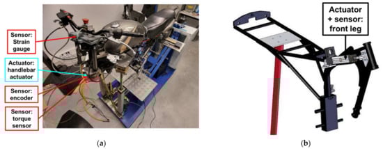 (a) Localization of the sensors and actuators of the motorized handlebars; (b) CAD model of the handlebars/rider distance control system and localization of the sensors and actuators (copyright: TS2—SATIE—MOSS, Univ Gustave Eiffel).