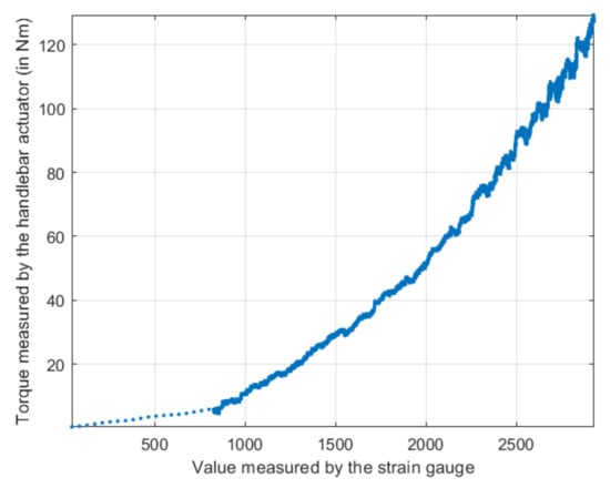 Data used for determining the steering torque as a function of actuator data and strain gauge data (data collected in the case of our POC): torque measured by the handlebar actuator (in Nm) as a function of the value measured by the strain gauge (dimensionless 12 bits value ranging from 0 to 4095) without human action.